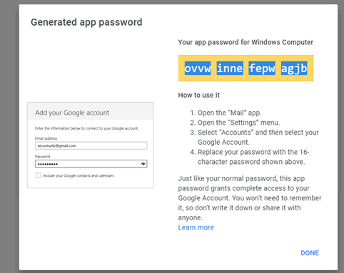 A new window will generate, with the App password. We recommend screenshotting this window to keep for v10 setups.