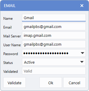 Within the email account setups, the App password generated in the step above must be used in place of the email account password. Once this has been added, validation can be confirmed by clicking on the validate button.