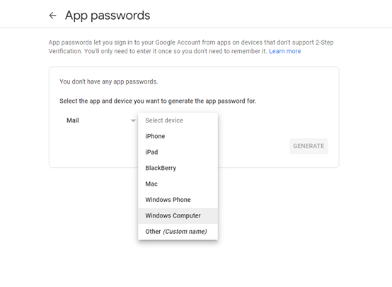 Within App passwords, choose Mail, and the device that will be accessing the email account, and then choose generate.