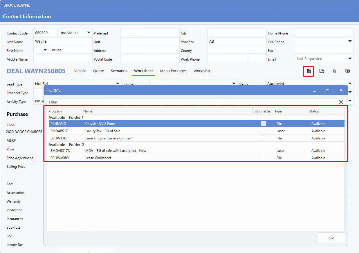 at the top of the Deal screen opens the Forms List window, allowing Users, with the necessary permission, to view and print the Forms.