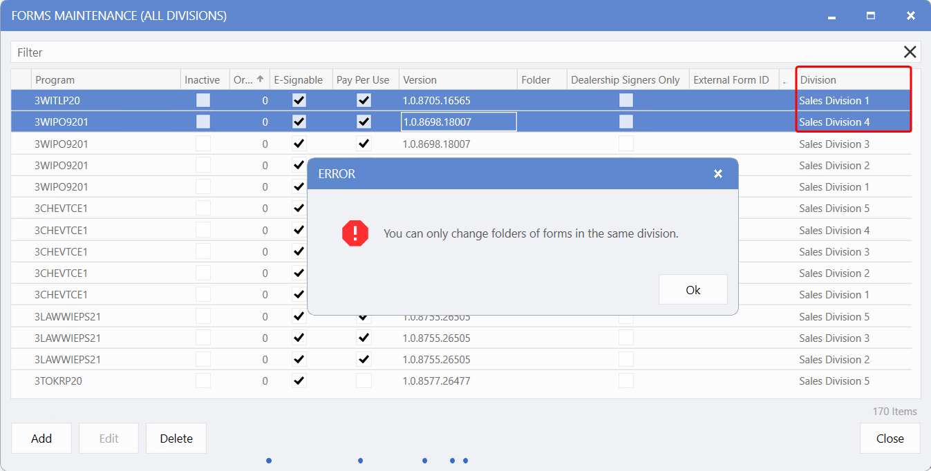 Forms - and their associated folders - are division-specific. Folders can only be updated for one division at a time.
