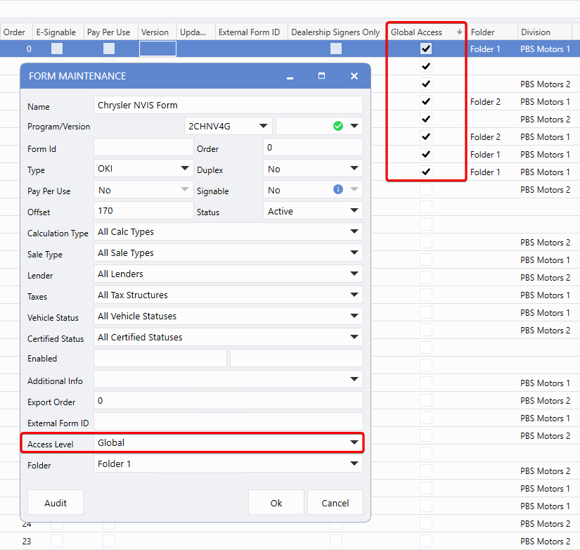 A checkmark column has also been added to the Forms grid, making it easy to identify which forms have Global Access enabled.