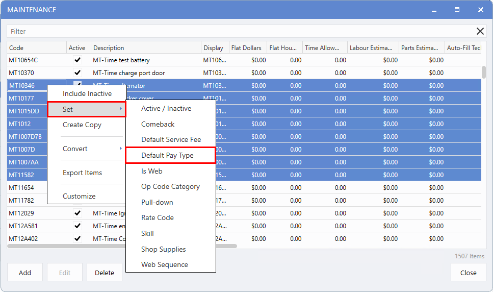 Fixed Ops > Service Order > Maintenance > Service Setups > OP Codes > Select Op Codes > Right-click > Set > Default Pay Type