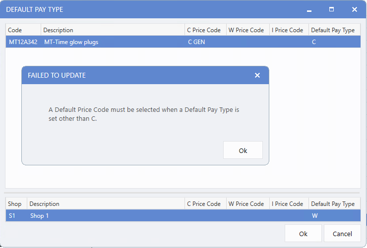 If the default pay type is set to W (Warranty) or I (Internal) without an associated default price code, a