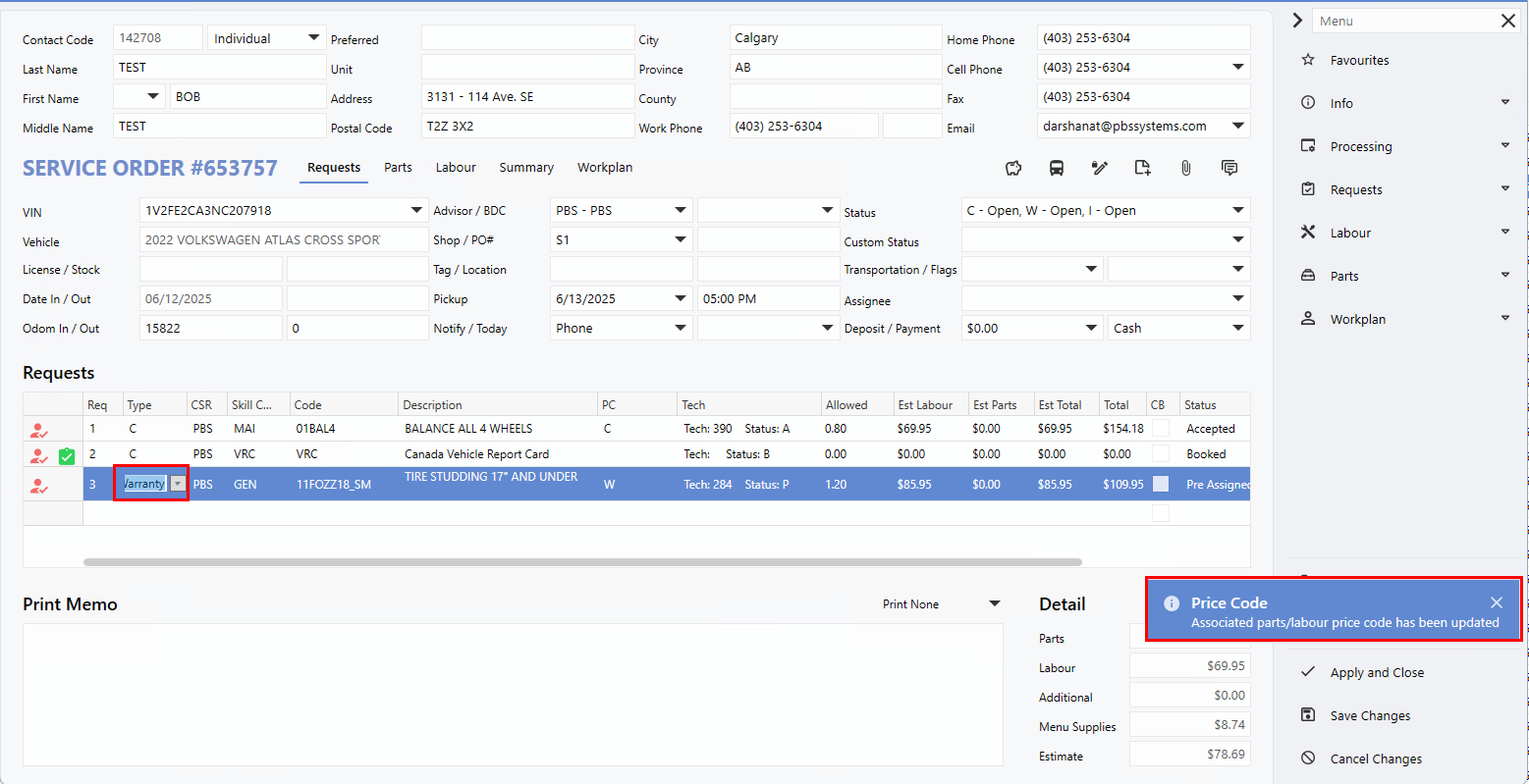 for Dealerships that typically answer "Yes" to these prompts. With this setting enabled, the pay type and associated price codes update automatically, and an informational flyout appears to confirm the changes - eliminating unnecessary clicks and reducing the risk errors caused by answering "No."