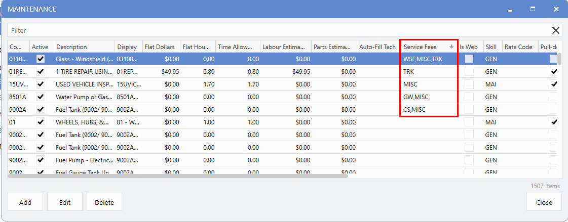 . This lets the User quickly see which Op Codes include Service Fees without opening each individual Op Code, making review and management much easier.