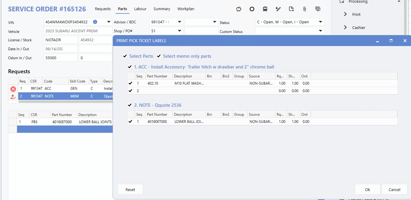 Service Order > Parts tab > Processing (Right-hand menu) > Print > Pick Ticket Labels
