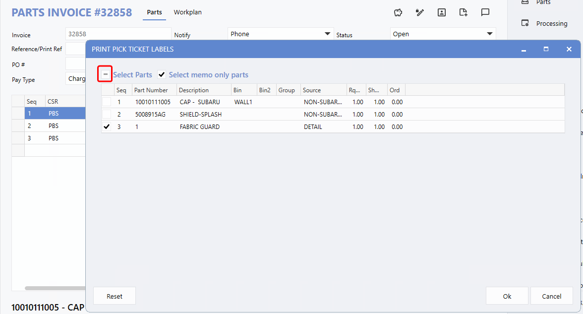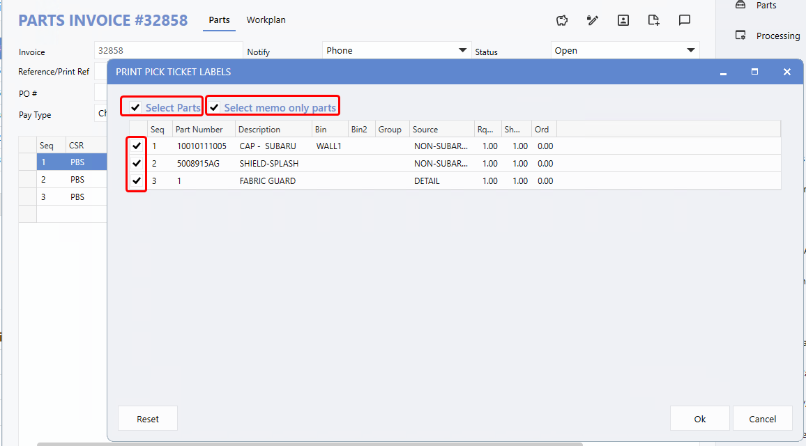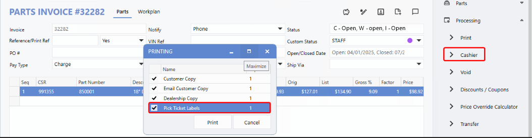 Parts Invoice/Service Order > Processing > Print > Pick Ticket Labels