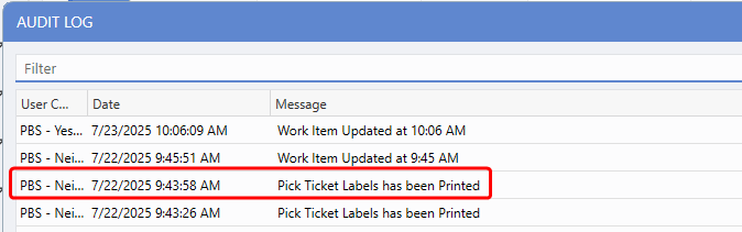 Previously, the Audit Log only recorded Pick Ticket Label printing when initiated from the right-hand menu. With this update, it now also captures print actions triggered via the