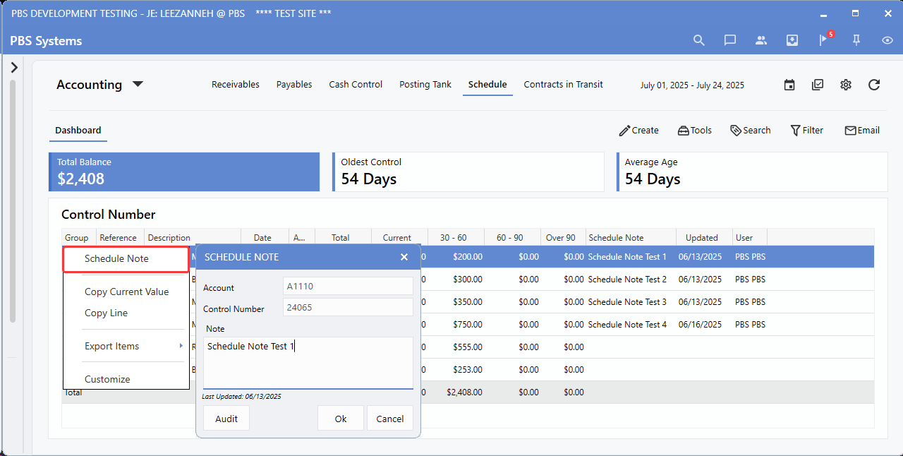 Schedule Dashboard > Right-Click Control line > Schedule Note