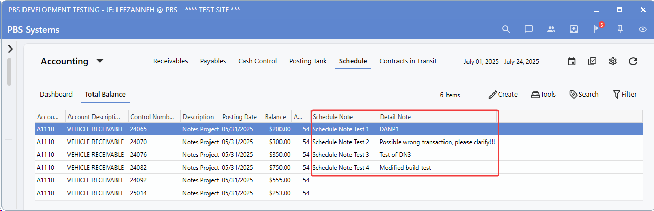 Schedule Notes remain prominently displayed under the account header for essential control-level context, while Detail Notes icons appear right next to Journal Codes - placing transaction-specific commentary exactly where it's needed.