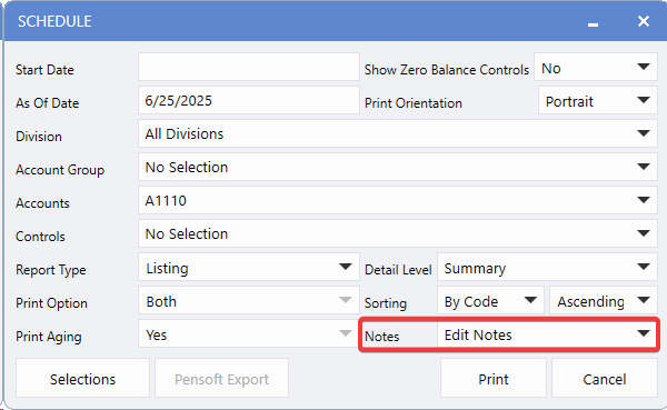 Accounting > General Ledger > Reports > Schedule > Select Account > Notes dropdown > Edit Notes