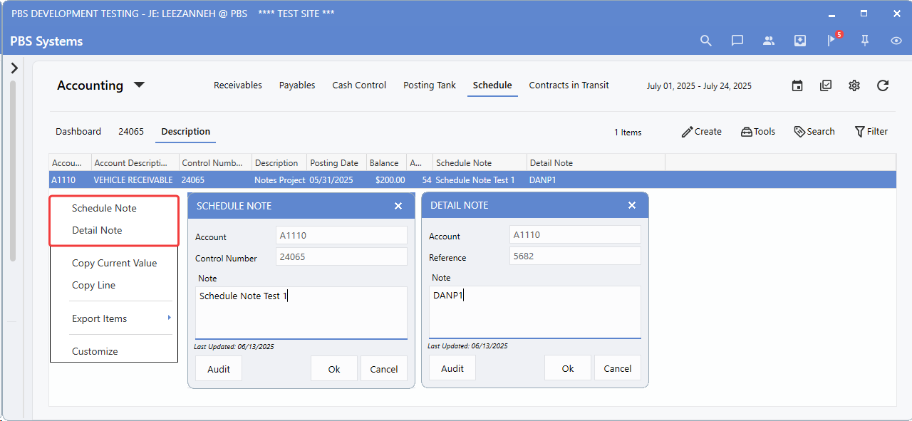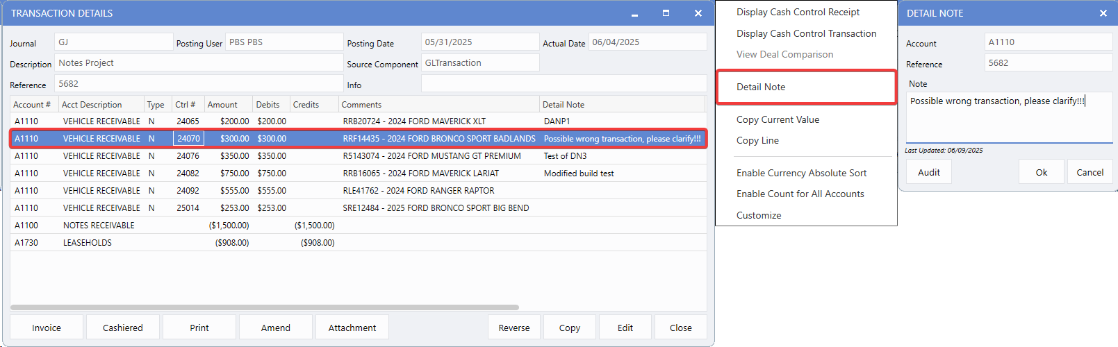 In the Detail view, right-click functionality gives Users instant access to the documentation tools they need - adding Notes to an entire Control or commenting on a specific Transaction line. This streamlined approach eliminates unnecessary navigation, taking Users directly to the right spot for their documentation. Once added, the system automatically links each Note to the correct account and reference information, ensuring it stays tied to the proper transaction context.
