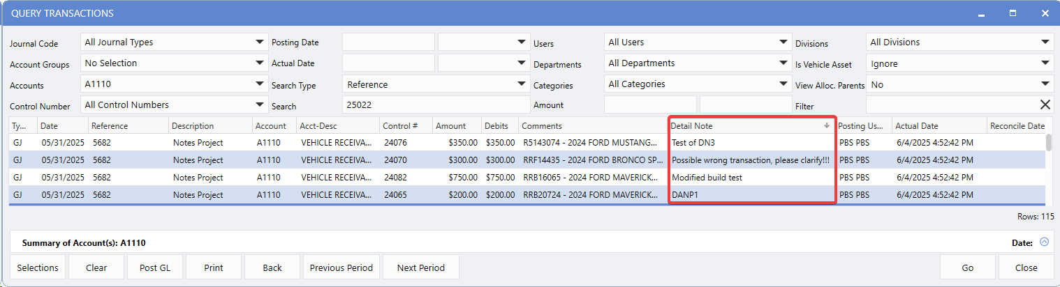 To use this feature: Open any Schedule Report, drill down to the Detail View, and see both note types seamlessly integrated into your transaction reporting.