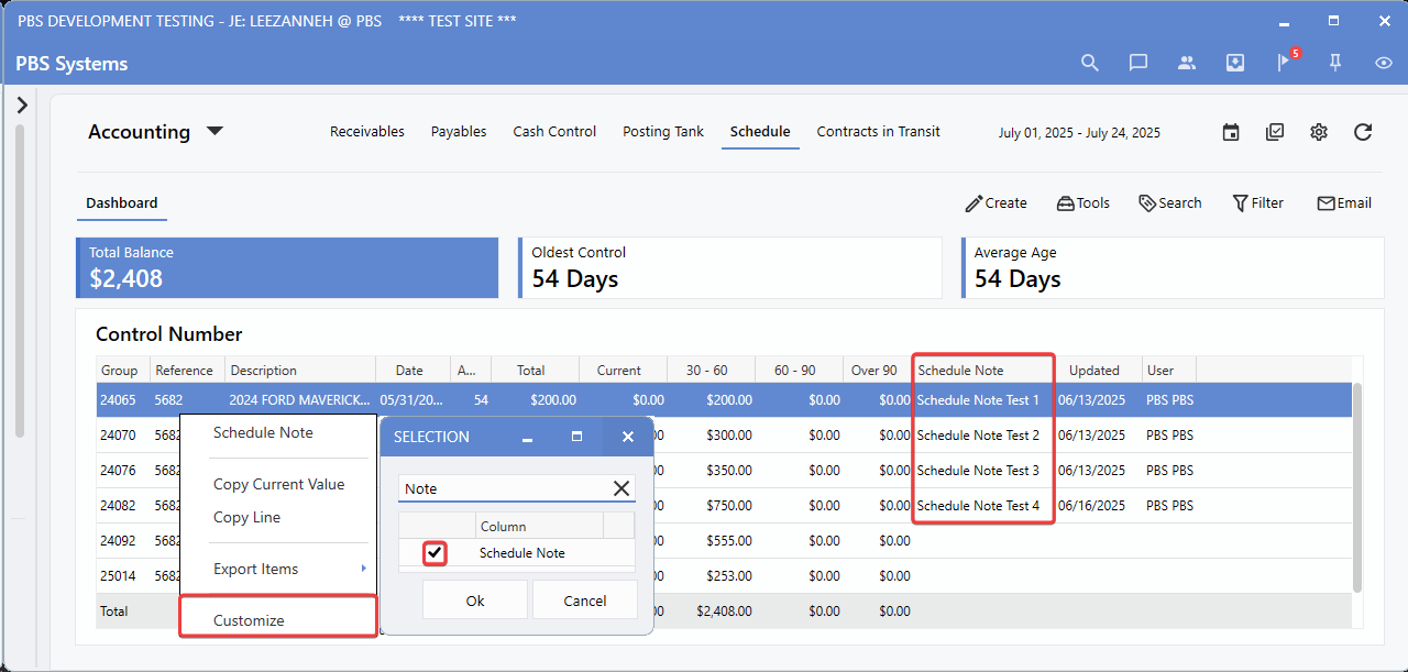 Schedule Dashboard > Right-click > Customize > Schedule Note