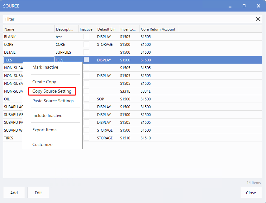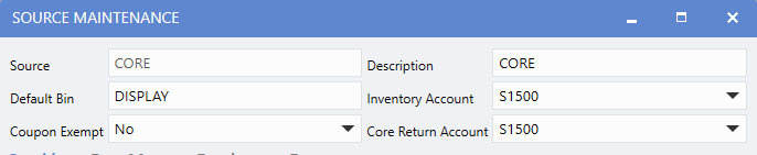 settings, only the Default Bin, Inventory Account, and Core Return Account are transferred. The Source Name and Description remain unchanged to avoid duplicates.