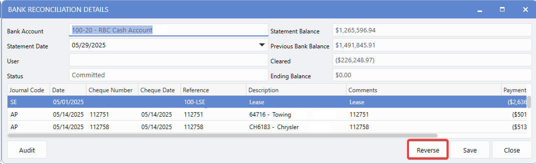 The reverse function enables Users to undo a Committed Bank Reconciliation when an error is discovered. to protect data integrity, this feature is limited to the