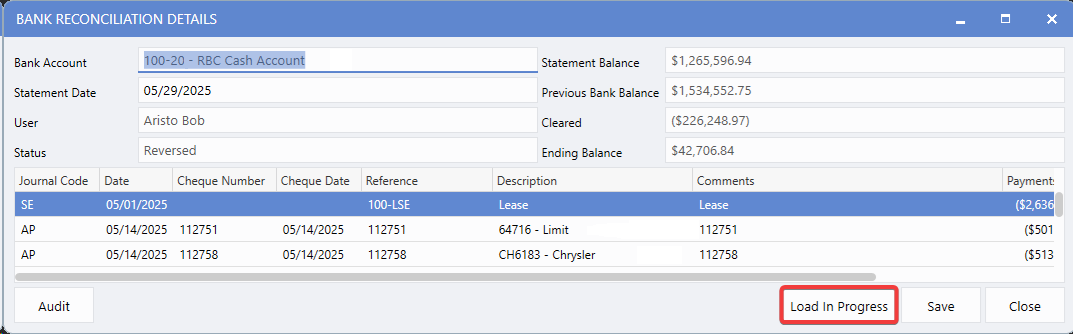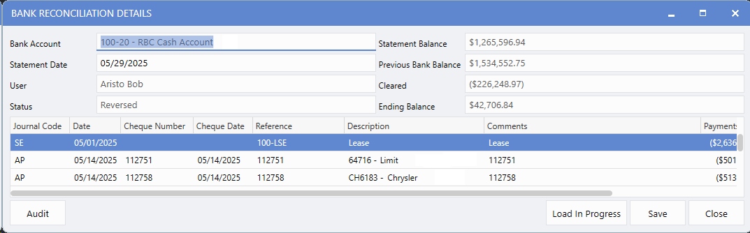 After reversing a reconciliation, Users can restore it to In-Progress status with all previously cleared transactions preserved. This eliminates the need to re-select the same transactions that were already reconciled correctly, saving time and reducing errors.