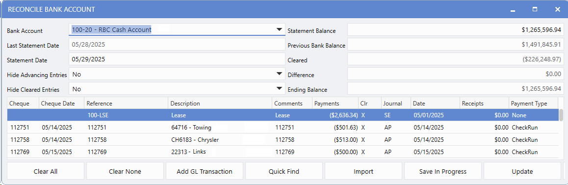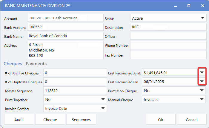 The Bank Maintenance window now features automated reconciliation tracking with two key fields: