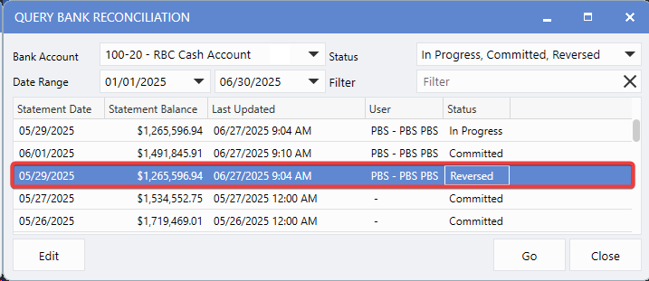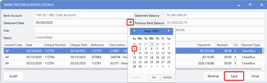Users can now update statement dates directly from the Bank Reconciliation Details window when errors are identified after a reconciliation is completed. This removes the need to contact support for date corrections during month-end processing.