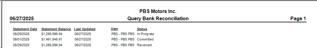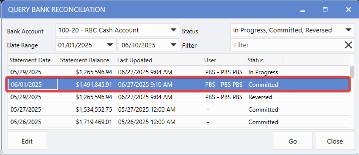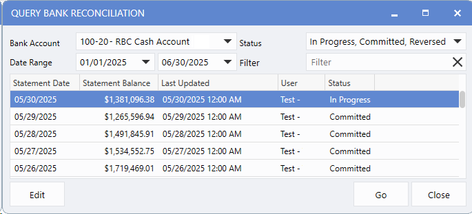 Accounting > Bank Manager > Query Bank Reconciliation