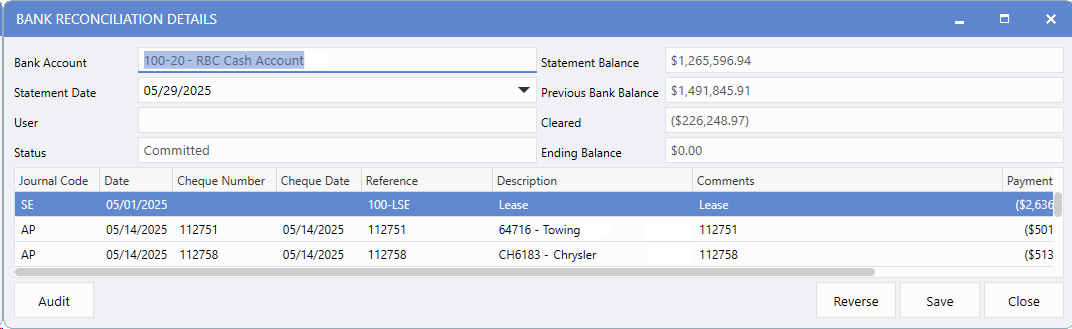 Viewing Bank Reconciliation Details