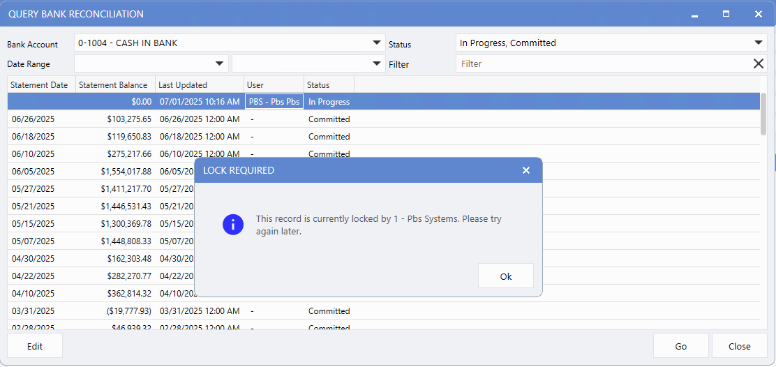 If another User is actively reconciling the same bank account in Reconcile Account, a data lock message will appear.