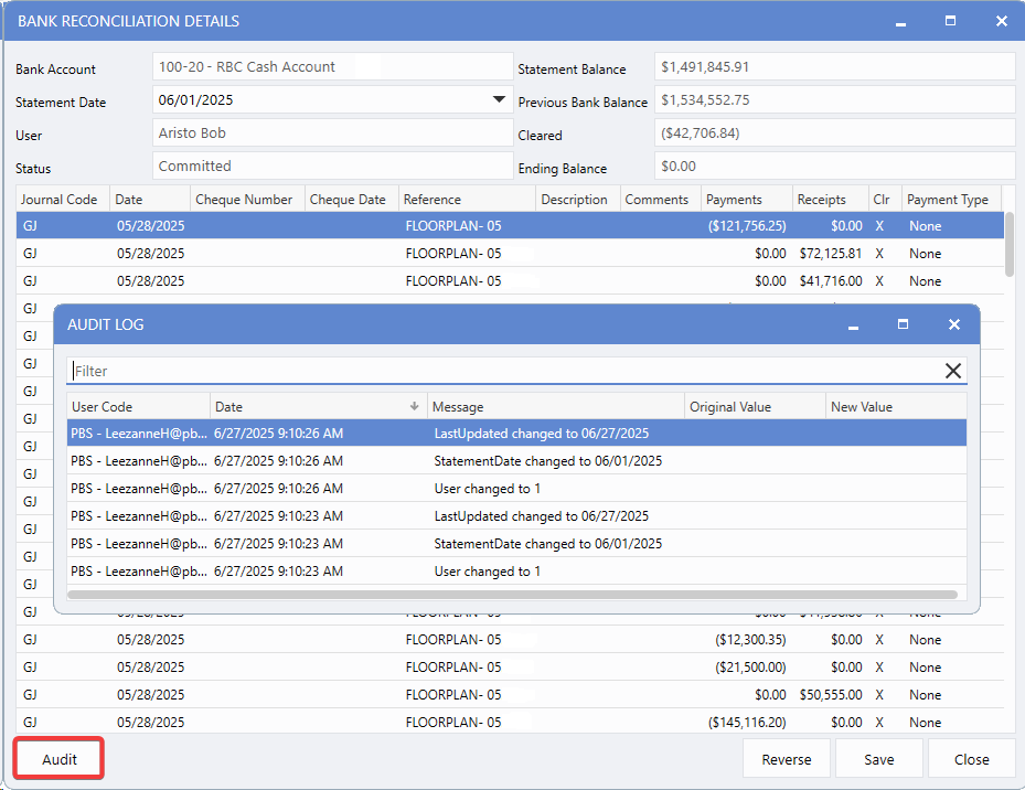 Enhanced audit trails record all changes to Bank Reconciliations - including date edits and status update - ensuring complete accountability and traceability of reconciliation activity.