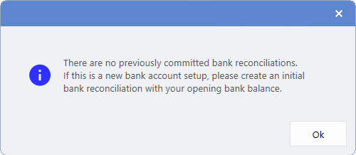 For new Bank Accounts with no committed reconciliation history, the Last Reconciled Amount and Last Reconciled On fields will be blank. If Users attempt to click the drop-down buttons next to these fields, a warning will indicate that no reconciliation data is available.