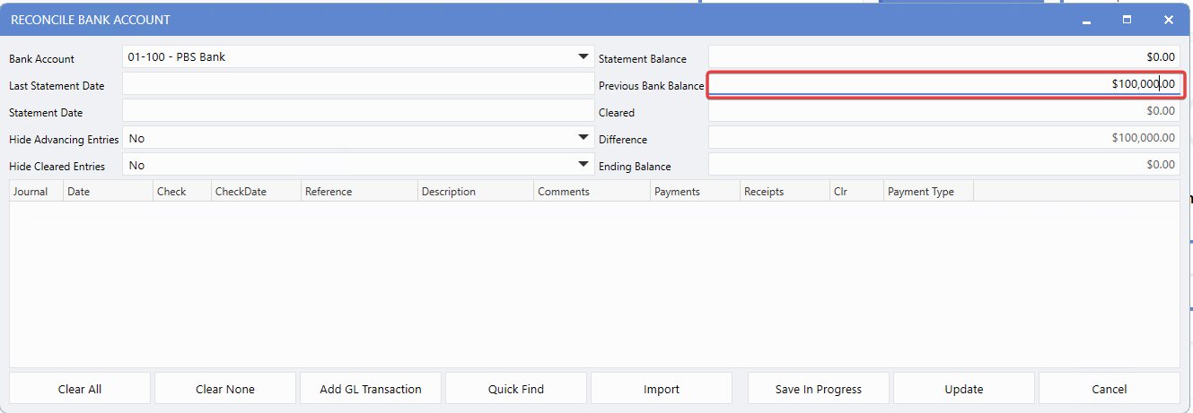 To establish the initial bank balance, Users can free-type the amount in the Previous Bank Balance field during the first reconciliation process. This sets the baseline for all future reconciliations.