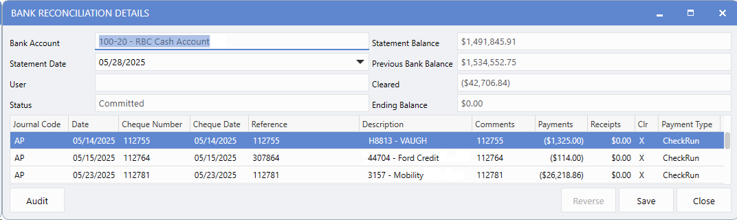 The Bank Reconciliation Details window provides a complete, read-only view of a specific reconciliation, including all cleared transactions, statement details, and reconciliation status. This allows Users to quickly review historical reconciliation data without making changes.