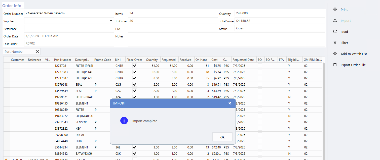 After the import is complete, a confirmation message will appear. The Parts data exported from the Daily Inventory Preview grid will then be ready for use in the Order window.
