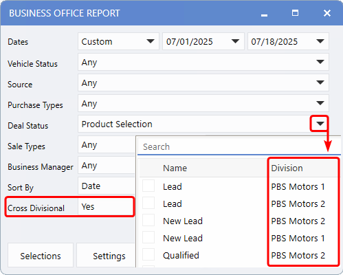 For Divisional Dealerships, setting the Cross Divisional field to 'Yes' adds an extra column showing the Division name in the window.