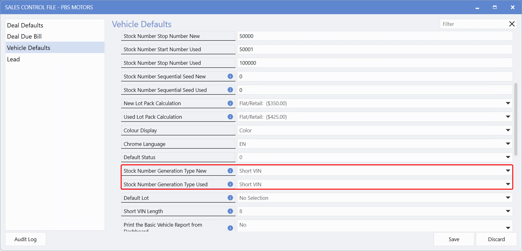 Systems > Maintenance > Sales Control File > Vehicle Defaults