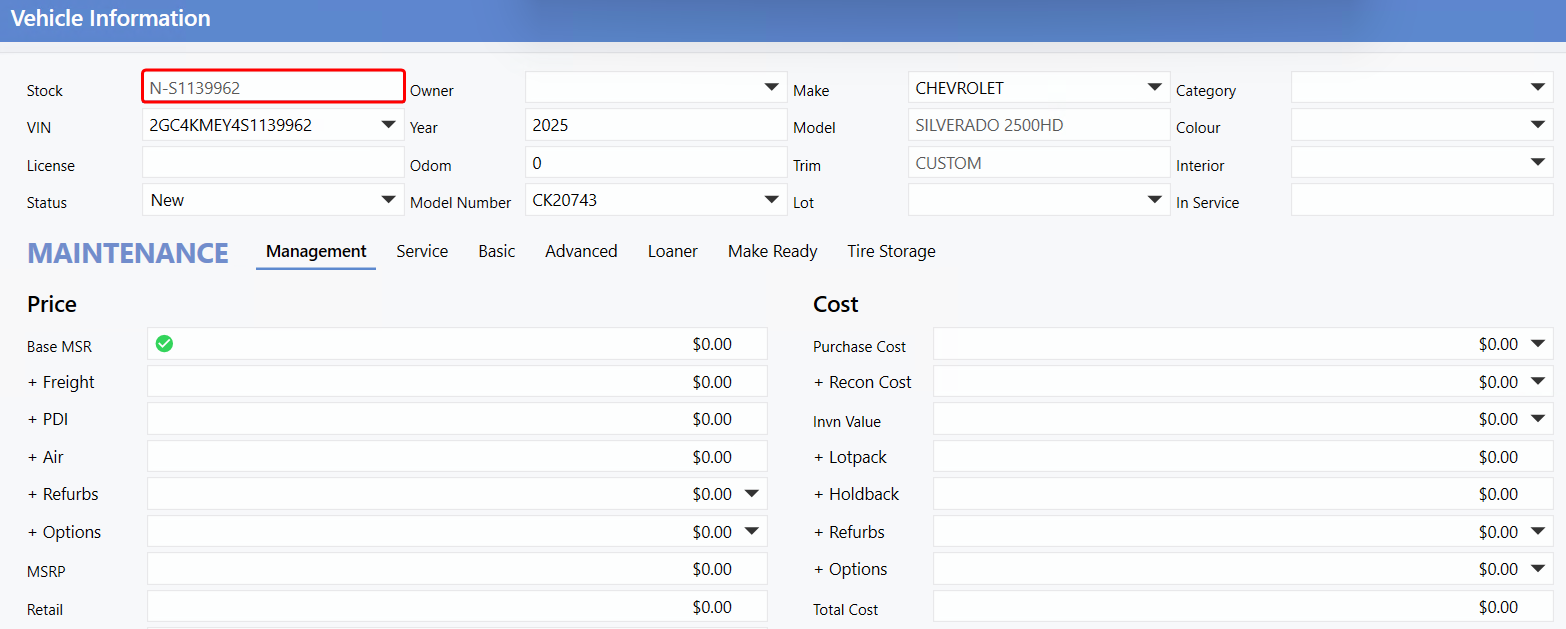 As a result, the generated Stock Number begins with N- and ends with the last 8 digits of the VIN, as shown in the Vehicle File image.