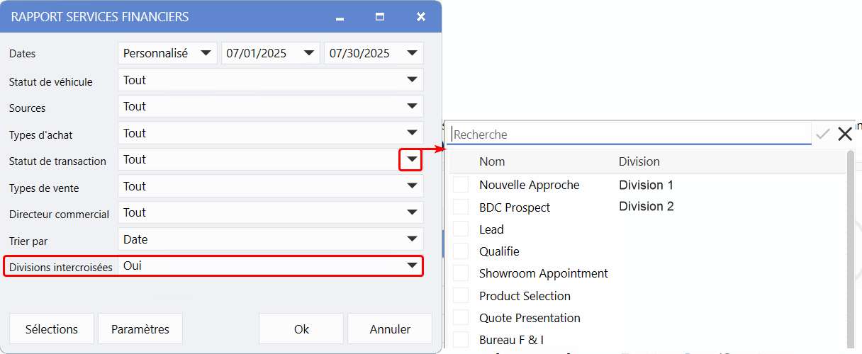 Pour les concessionnaires avec plusieurs divisions, le champ Divisions intercroisées peut être activé (Oui), afin d'afficher une colonne supplémentaire dans les menus déroulants indiquant le nom des divisions.
