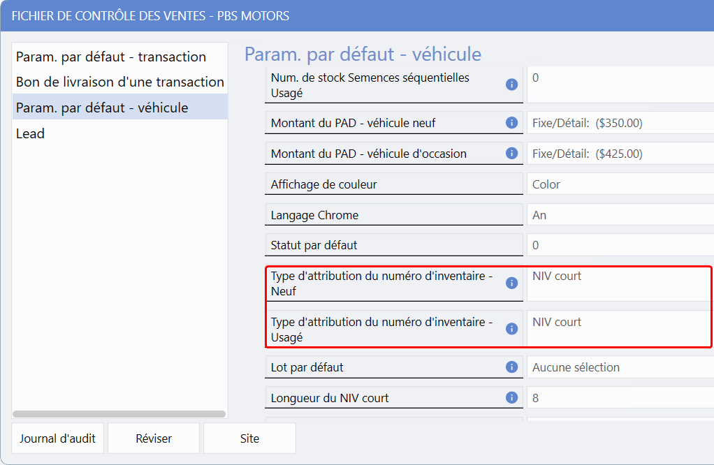 Système > Maintenance > Fichier de contrôle des ventes > Param. par défaut - véhicule