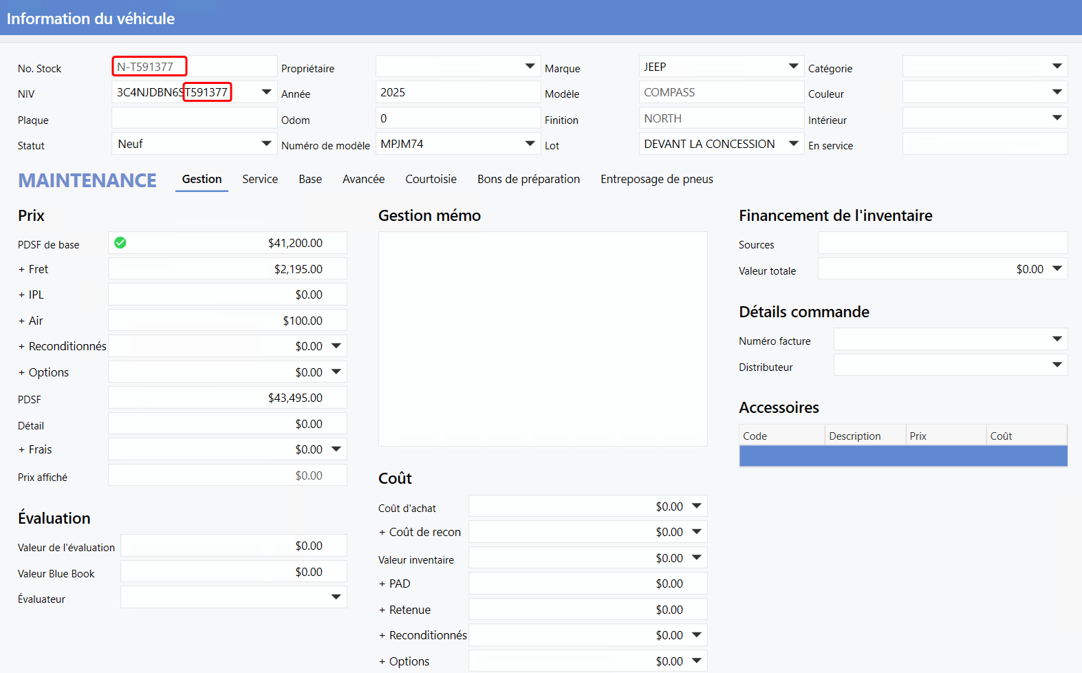 De ce fait, le numéro d'inventaire généré débute par un N- et se termine avec les 8 derniers chiffres du NIV, comme le montre l'image du dossier du véhicule ci-dessous.