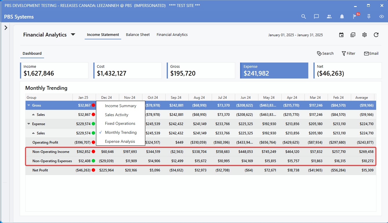 Dashboard > Income Statement > Monthly Trending View