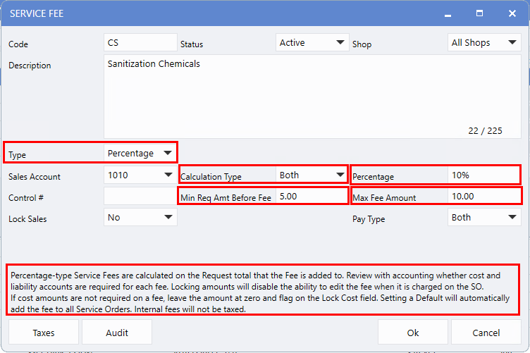 : If both Min and Max are set to zero, the fee is treated as having no threshold. If the fee is locked, then the percentage amount set up will apply.