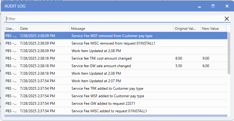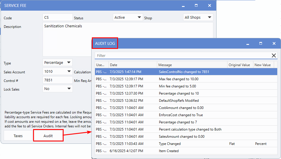 The Audit Log window has been enhanced to offer improved visibility into changes made within Service Fee setups. Users can now easily track updates to the following:
