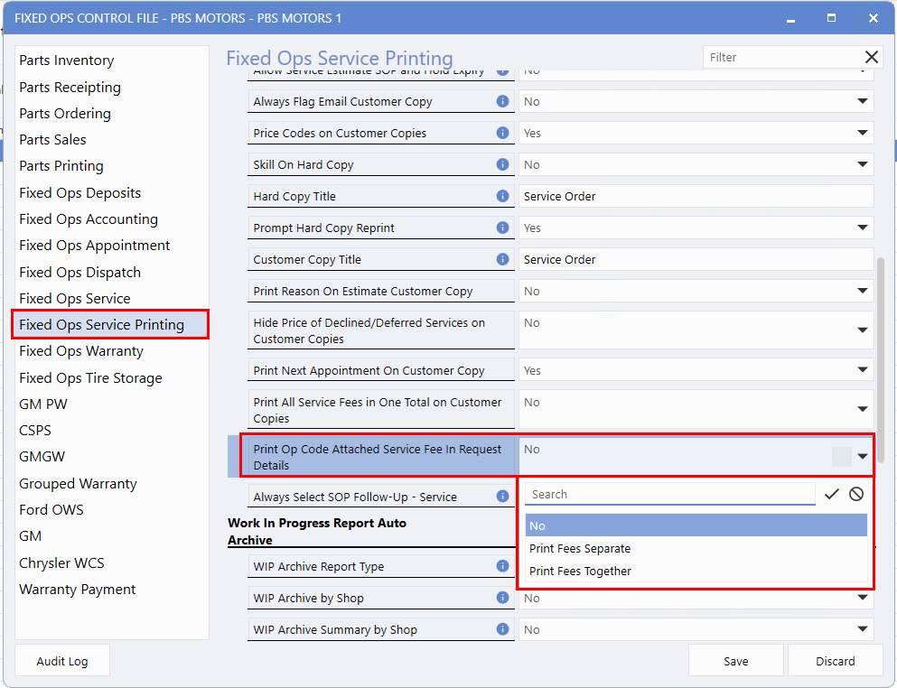 setting in the Fixed Ops Control File has been updated. Dealerships can now choose whether to print the op code linked to the Service Fee within the Request Details, print fees separately, or print together - offering greater flexibility in reporting.
