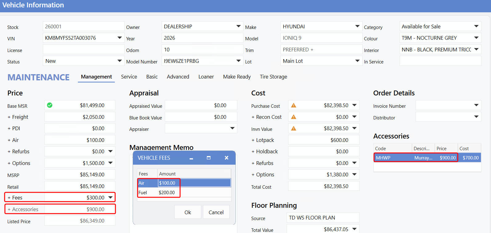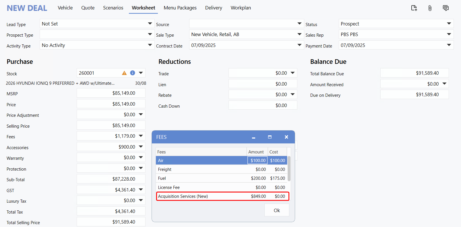 The Deal automatically displays the Air and Fuel Fees, along with the Accessory charge, as transferred from the Vehicle file. However, the Acquisition Services Fee of $849.00 is pulled from the