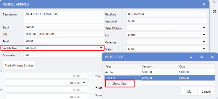 can be modified from the Vehicle Fees window or directly within the Vehicle file once the Vehicle is marked as Arrived. As with other Cost-related views, you can right-click to Show/Hide Cost as needed.