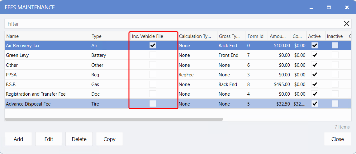 This is because it is marked as "Excluded" in the Incl. Vehicle File" field within the Fee settings window.