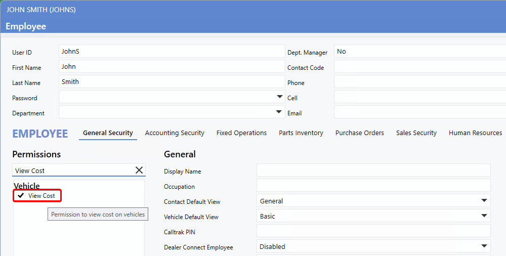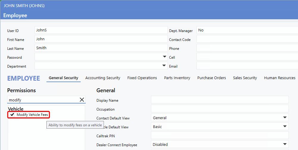 A new permission setting has been added to User Maintenance, allowing Dealerships to control which Users can modify Vehicle Fees.
