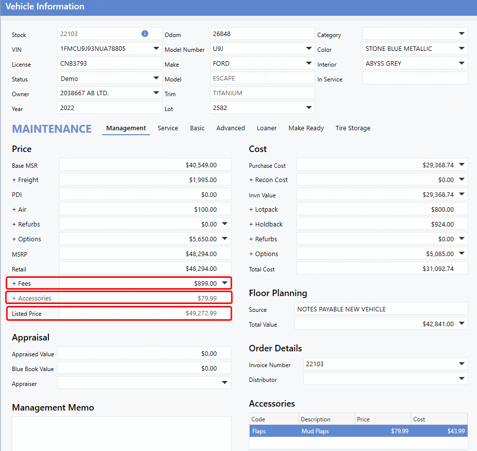 : In the Vehicle file, fees will only appear based on the assigned Vehicle Status and Vehicle Type. For example, if a Fee is configured for Used status, it will only be displayed when the Vehicle Status is set to Used.