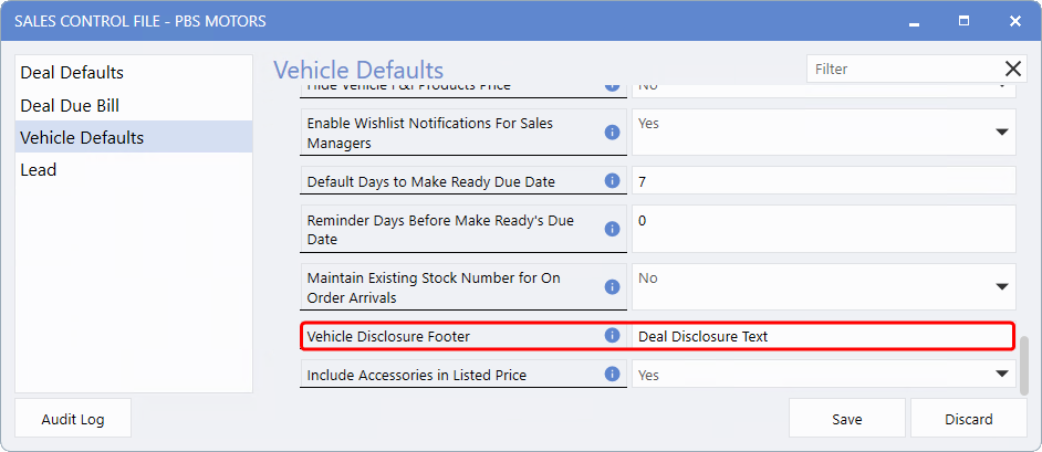 System > Maintenance > Sales Control File > Vehicle Defaults > Vehicle Disclosure Footer
