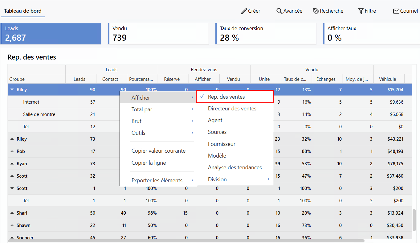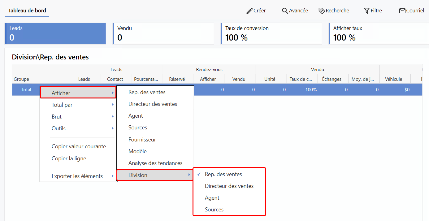 Pour les concessionnaires à divisions multiples, quatre nouvelles vues ont été ajoutées, en plus des options déjà disponibles. Ce qui permet d'analyser et de comparer la performance des Leads dans les différentes divisions.