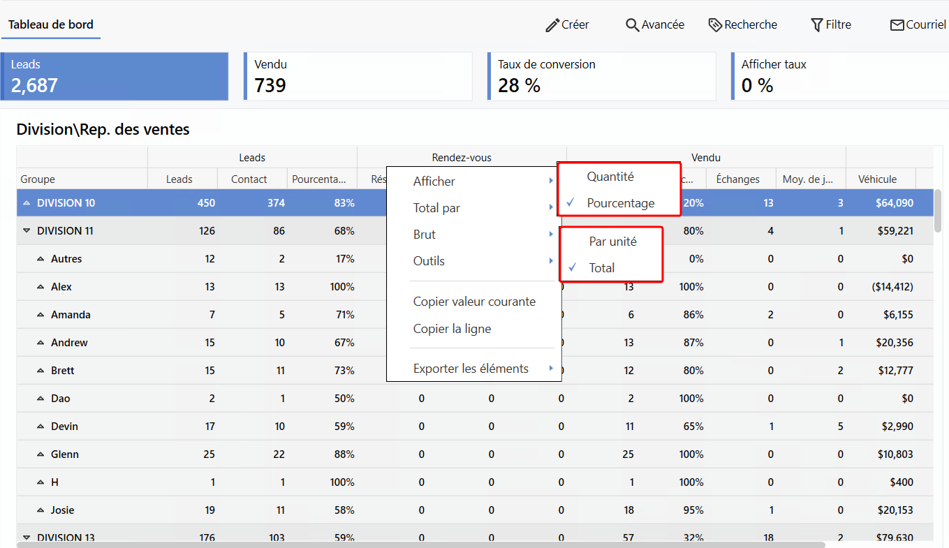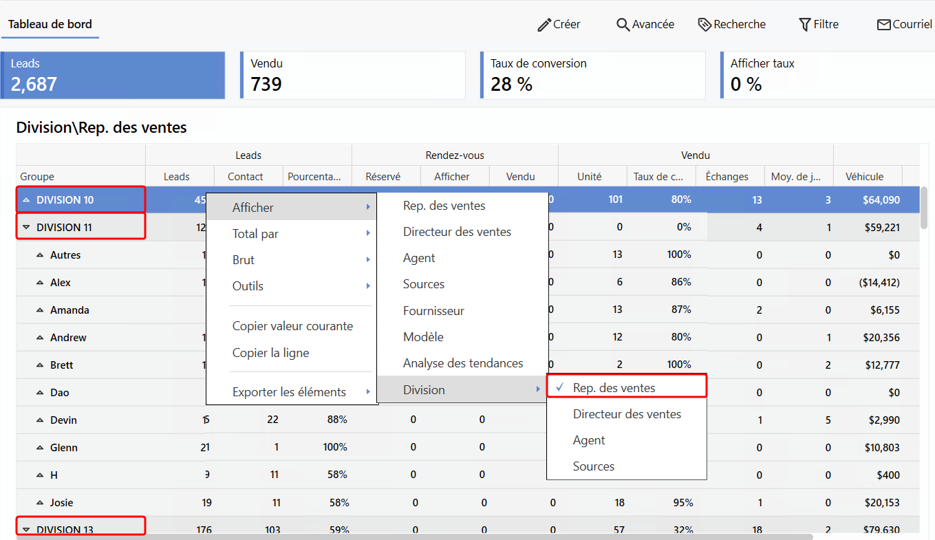 Dans la vue sommaire, les utilisateurs peuvent maintenant choisir d'afficher leurs données groupées par division. Chaque section d'une division peut être agrandie ou réduite à l'aide des flèches, ce qui permet de faire une comparaison claire et organisée. De plus, en cliquant sur le nom d'un représentant des ventes, les Leads qui lui sont assignés s'afficheront. Si la vue non divisionnelle est sélectionnée, les données de toutes les divisions seront présentées dans un format combiné pour une vue d'ensemble plus globale.